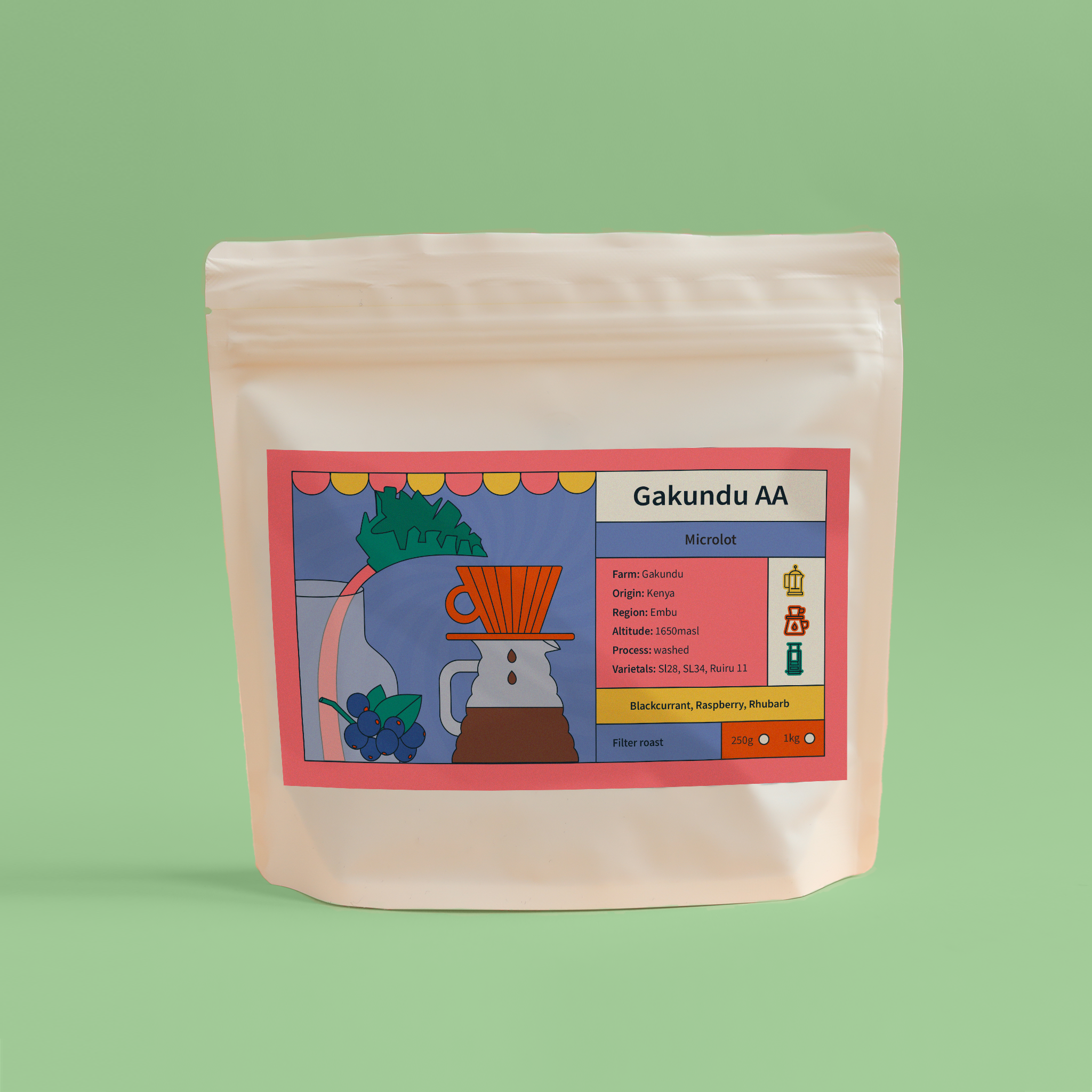 Der Filterkaffee aus Kenia besticht durch seine klaren Geschmacksnoten von Schwarztee, Hibiskus und süsser Kirsche. Sehr eleganter floraler Körper und leicht spritzige Säure sobald er abkühlt.