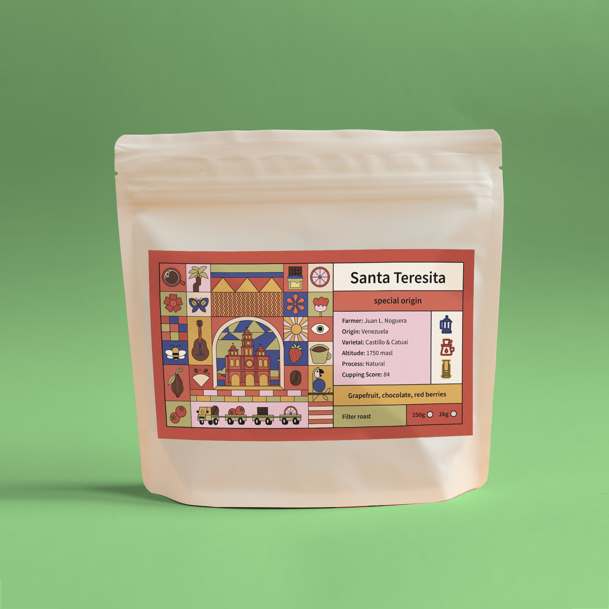 Wir sind unglaublich happy, endlich mal einen Kaffee aus Venezuela anbieten zu können, da Carla, unsere Graphic Designerin ursprünglich von dort kommt und besonders viel Liebe ins Detail gesteckt hat. Wir sind seit mittlerweile 3 Jahren auf der Suche nach einem Kaffee der zu unserem Portfolio passt und sind endlich fündig geworden.Das Resultat könnt ihr mit unserem Santa Teresita verkosten - wir freuen uns sehr, dass es endlich geklappt hat.